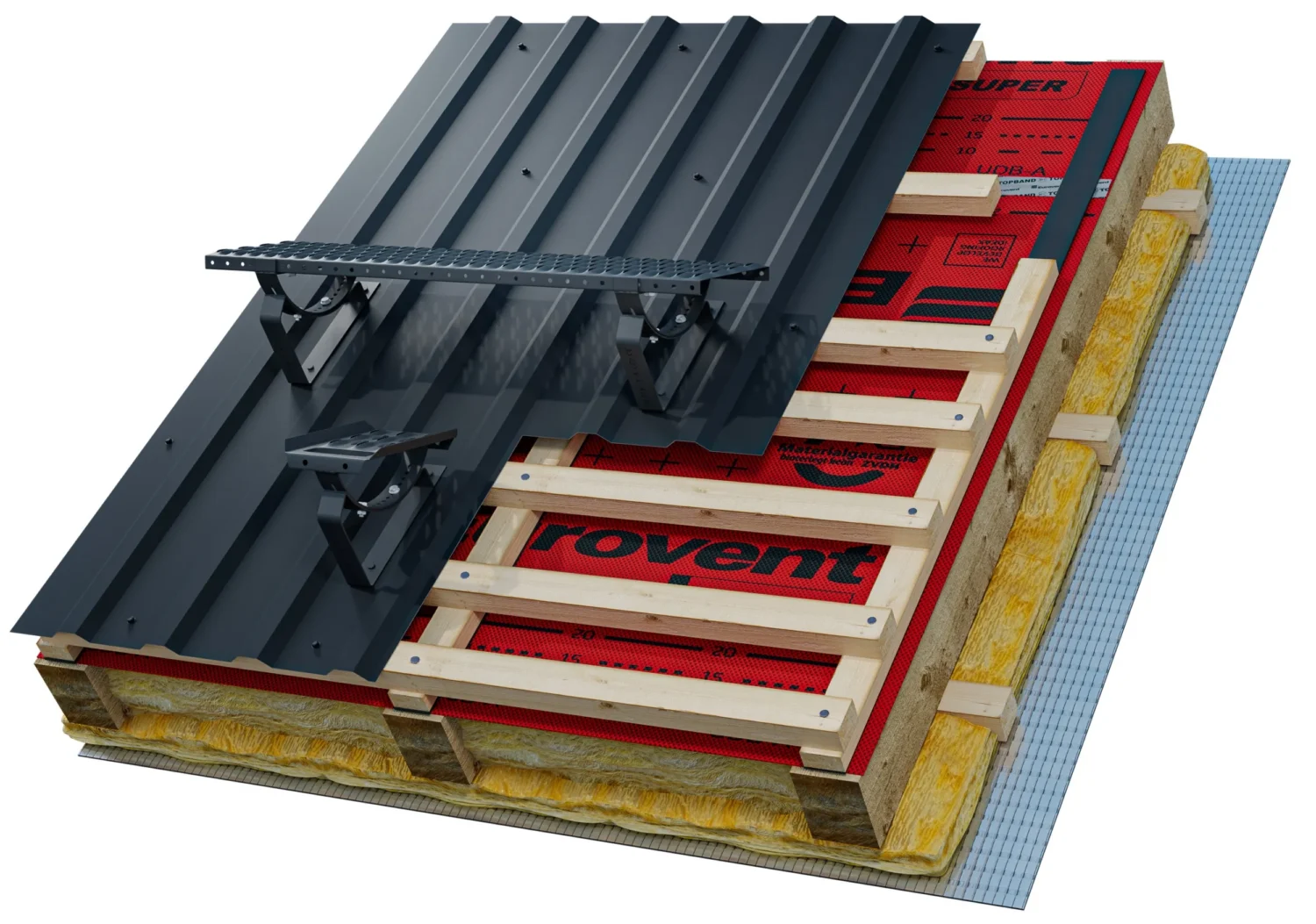 Ława kominiarska Eurovent® PLATFORM SET METAL UNI pełni funkcję elementu komunikacji dachowej, zapewniając bezpieczne i wygodne poruszanie się kominiarza w strefie komina. Zestaw zawiera wszystkie niezbędne komponenty do prawidłowego montażu platformy. Dzięki szerokiemu wyborowi wsporników możliwe jest dopasowanie produktu do niemal każdego rodzaju pokrycia dachowego. Zalecany montaż na połaciach dachowych o kącie nachylenia od 15° do 60°.