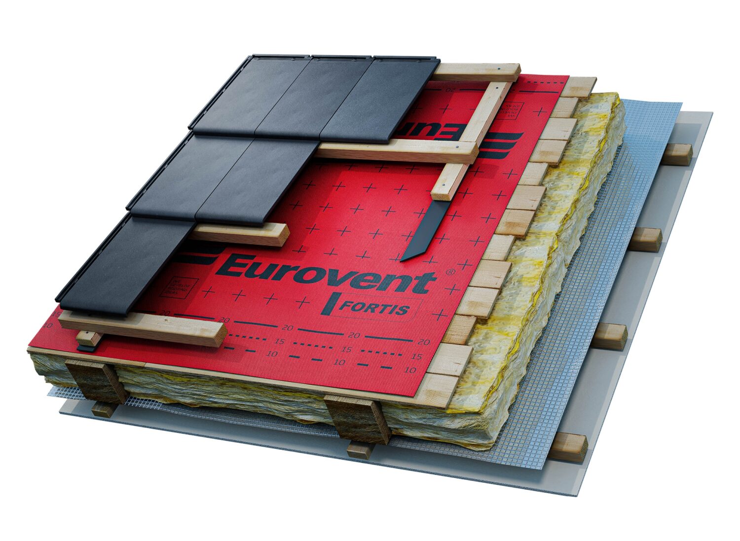 Membrana dachowa Eurovent® FORTIS, trójwarstwowa, wysokoparoprzepuszczalna membrana dachowa stosowana do dachów skośnych ocieplonych i wentylowanych, także z pełnym deskowaniem. Posiada wysoką w swojej klasie odporność na rozrywanie. Nadaje się pod dachówki betonowe, ceramiczne, blachodachówki, blachy aluminiowe oraz łupek naturalny. Doskonale sprawdzi się w budownictwie szkieletowym, tradycyjnym oraz pasywnym czy modułowym.