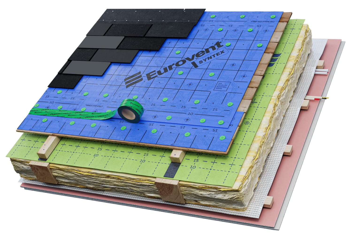 Eurovent® SYNTEX to czterowarstwowa membrana dachowa wykonana z materiałów syntetycznych, przeznaczona do stosowania pod pokrycia z gontu bitumicznego, gontu drewnianego oraz łupka. Wyróżnia się podwyższoną szczelnością na wodę oraz wyjątkowo wysoką odpornością na rozdzieranie. Zastosowanie specjalnych dodatków stabilizujących zapewnia bardzo dobrą ochronę przed promieniowaniem UV i umożliwia wykonanie ostatecznego pokrycia dachowego nawet po dłuższym czasie od montażu membrany.