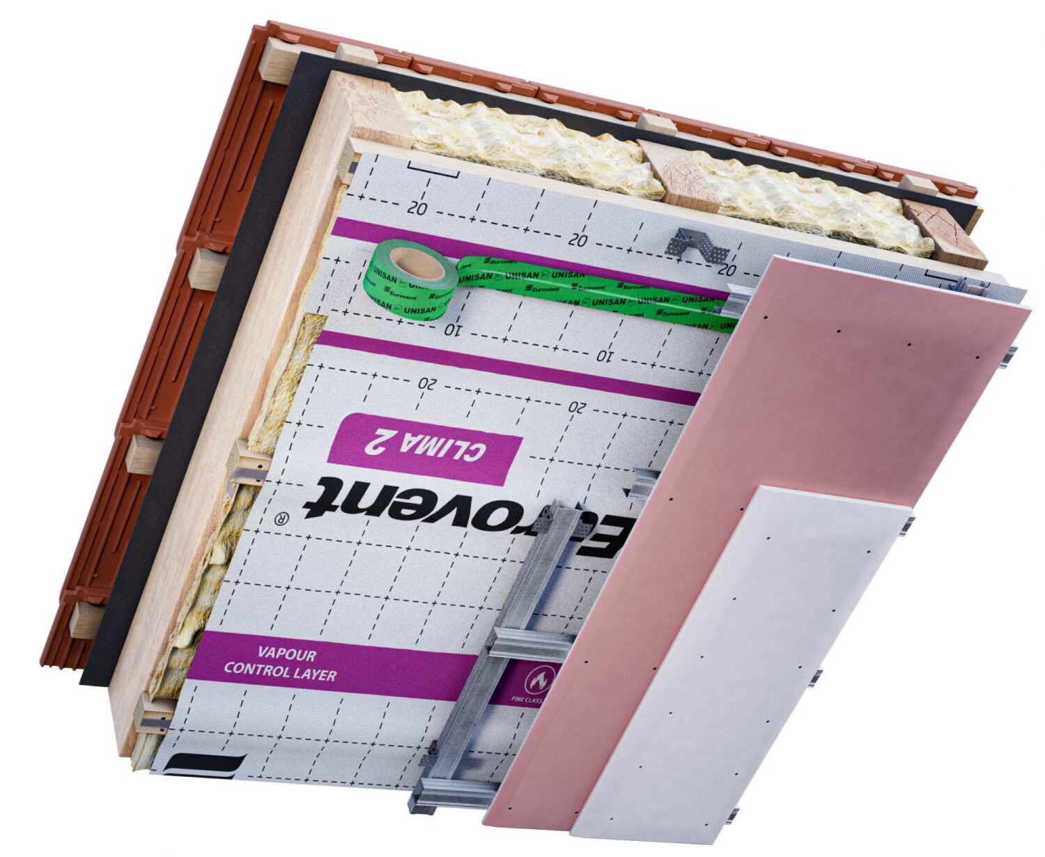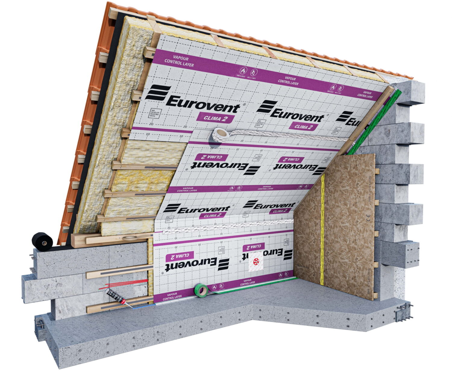 Membrana paroizolacyjna Eurovent® CLIMA 2 stosowana jest jako warstwa zabezpieczająca poddasza oraz ściany przed przenikaniem nadmiernej wilgoci z wnętrza budynku do izolacji cieplnej. Dzięki aktywnym właściwościom reguluje przepływ pary wodnej, zapobiegając efektowi „worka foliowego” oraz ograniczając ryzyko rozwoju pleśni i grzybów. Eurovent® CLIMA 2 rekomendowana jest do zastosowań w budownictwie mieszkaniowym i przemysłowym oraz sprawdza się w różnych technologiach konstrukcyjnych, takich jak prefabrykowana, modułowa, szkieletowa i tradycyjna. Podczas montażu zaleca się stosowanie taśm klejących Eurovent® UNISAN i Eurovent® DUO do łączenia zakładów membrany oraz taśmy Eurovent® UNO do szczelnego uszczelniania połączeń z elementami konstrukcyjnymi.