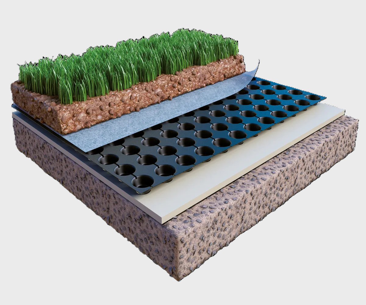 Folia drenażowa Eurovent® GEO 20 GARDEN przeznaczona jest do wykonywania poziomej izolacji przeciwwilgociowej w systemach dachów zielonych oraz tarasów użytkowych. Montowana z wytłoczeniami skierowanymi ku górze tworzy warstwę drenażową, która skutecznie odprowadza nadmiar wody podczas intensywnych opadów.